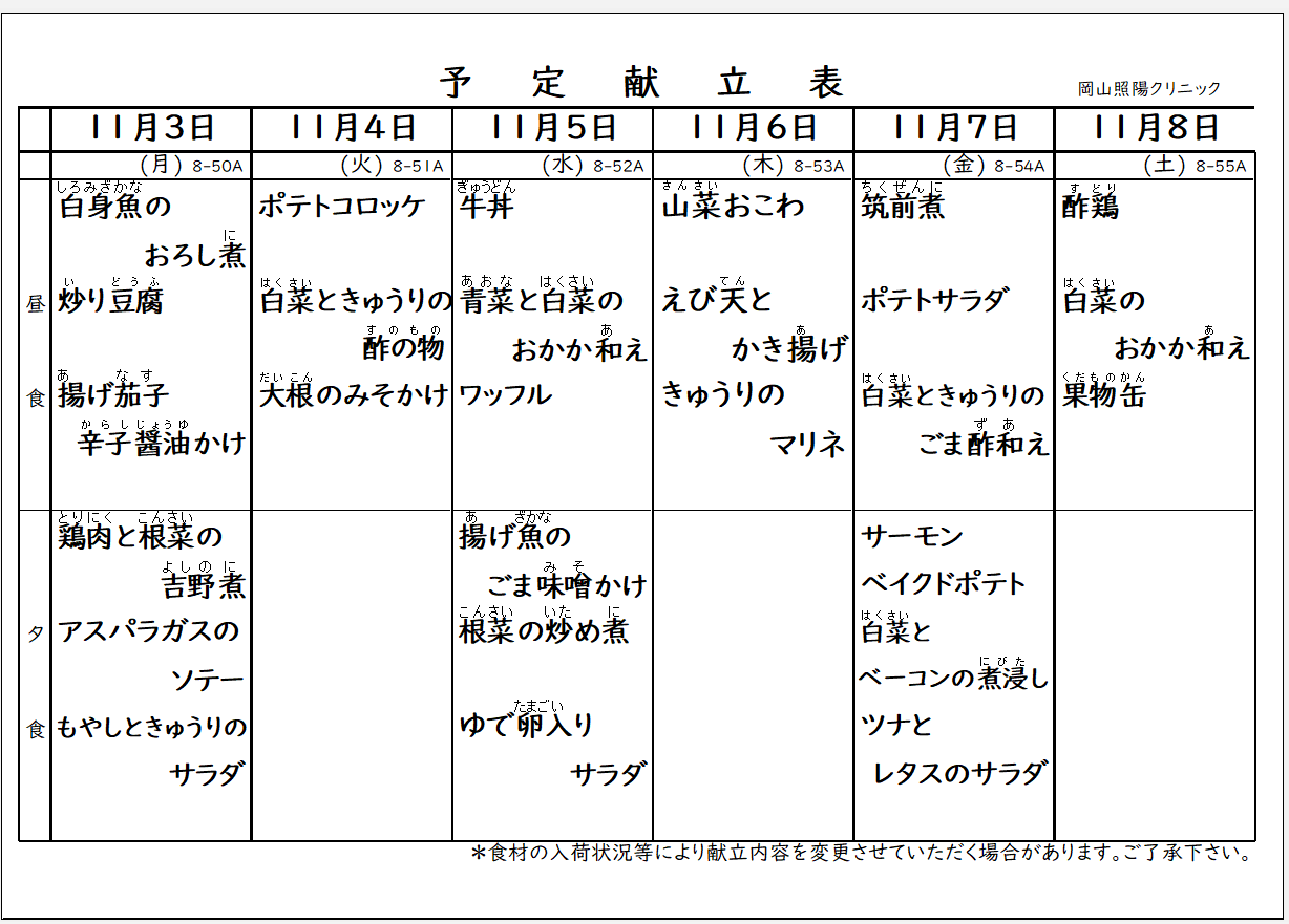 この献立は透析をされる方に適した献立となっております。 病状の特性上エネルギーを効率よく増やすため揚げ物など脂質や糖質を多く含む献立もあります。 他の疾患をお持ちの方が当院の献立を使用される場合はご注意ください。