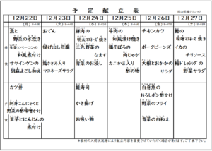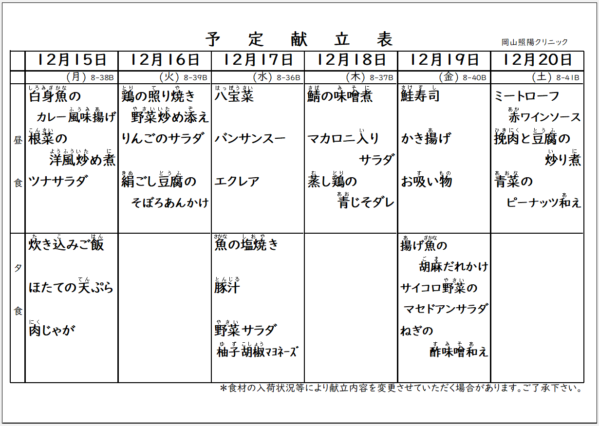 12月15日~12月20日の献立 2025年12月13日 最終更新日時 : 2025年12月5日 shouyou_editor この献立は透析をされる方に適した献立となっております。 病状の特性上エネルギーを効率よく増やすため揚げ物など脂質や糖質を多く含む献立もあります。 他の疾患をお持ちの方が当院の献立を使用される場合はご注意ください。