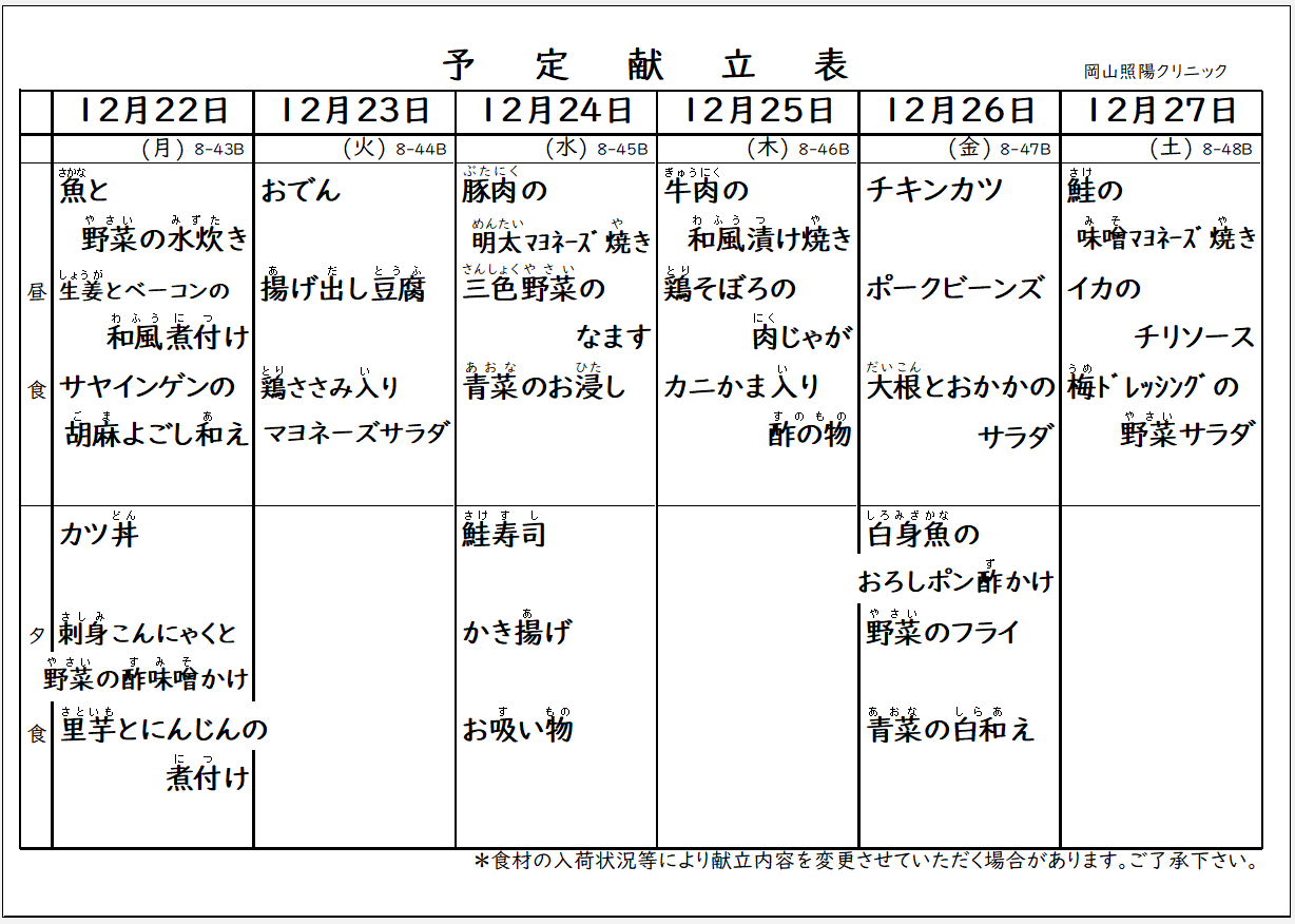12月22日~12月27日の献立 2025年12月20日 最終更新日時 : 2025年12月6日 shouyou_editor この献立は透析をされる方に適した献立となっております。 病状の特性上エネルギーを効率よく増やすため揚げ物など脂質や糖質を多く含む献立もあります。 他の疾患をお持ちの方が当院の献立を使用される場合はご注意ください。