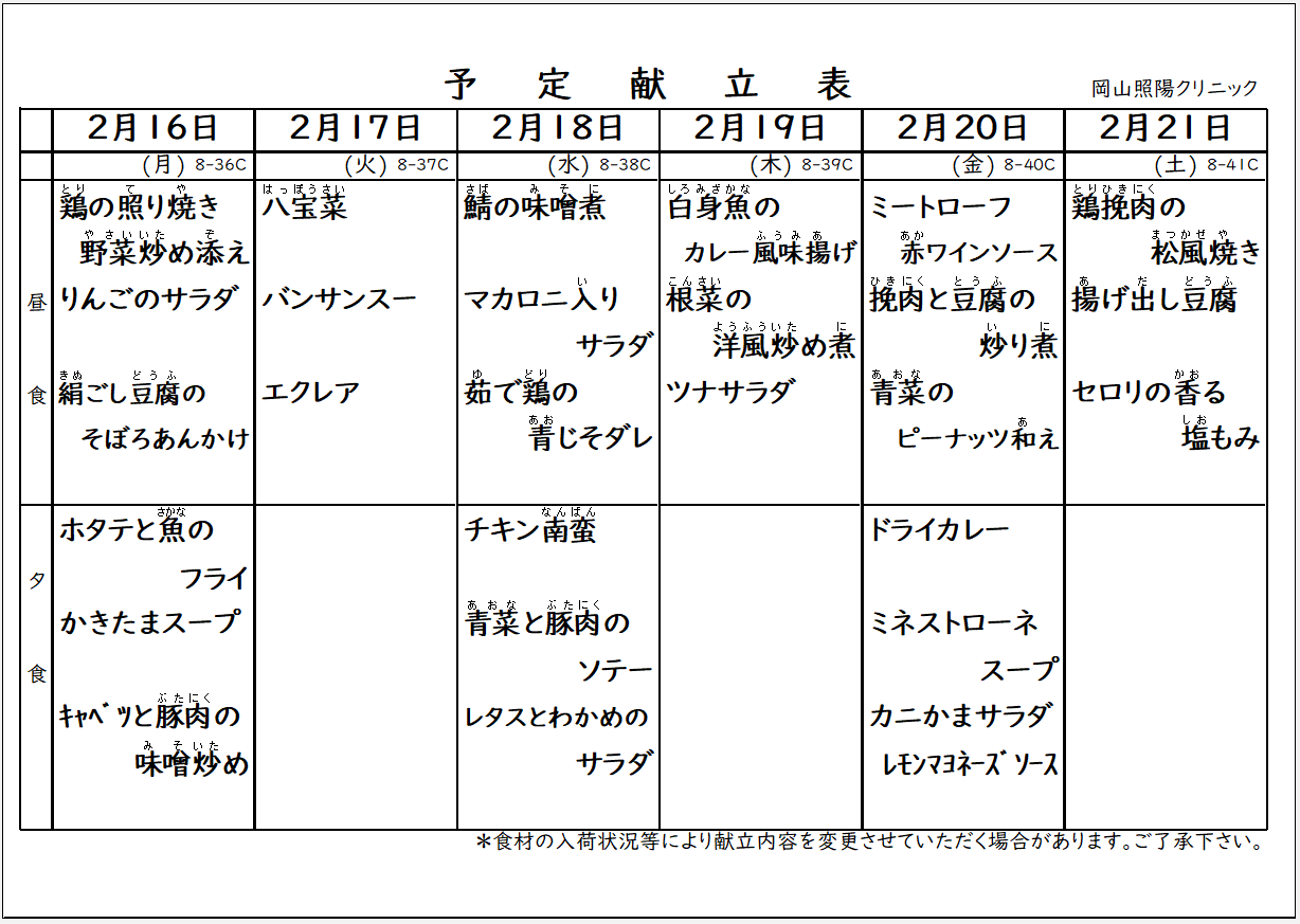 2月16日~2月21日の献立 2026年2月14日 最終更新日時 : 2026年1月24日 shouyou_editor この献立は透析をされる方に適した献立となっております。 病状の特性上エネルギーを効率よく増やすため揚げ物など脂質や糖質を多く含む献立もあります。 他の疾患をお持ちの方が当院の献立を使用される場合はご注意ください。