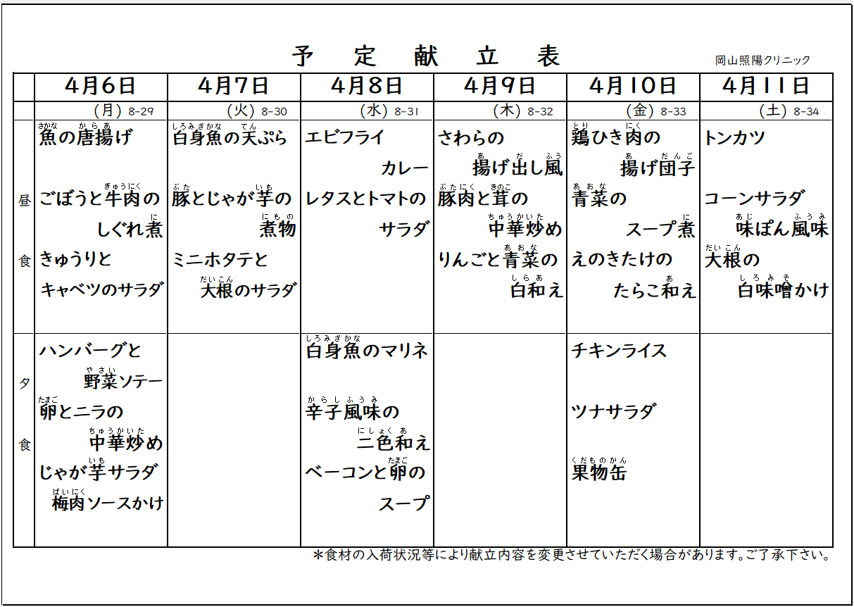 4月6日~4月11日の献立 2026年4月4日 最終更新日時 : 2026年3月28日 shouyou_editor この献立は透析をされる方に適した献立となっております。 病状の特性上エネルギーを効率よく増やすため揚げ物など脂質や糖質を多く含む献立もあります。 他の疾患をお持ちの方が当院の献立を使用される場合はご注意ください。