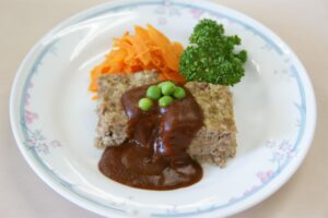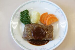 ・鉄板に油を塗りハンバーグの種をのせて形を整える。