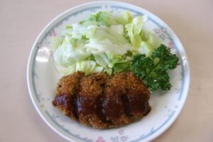 ・フライパンに油を敷き豚ロースをこんがりと焼き上げる。
