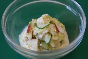 ・りんごは皮を半分程剥き、短冊切りかいちょう切りにして水に軽く浸けておく。