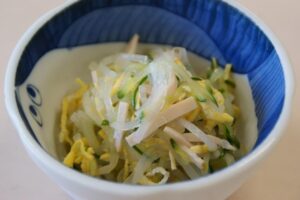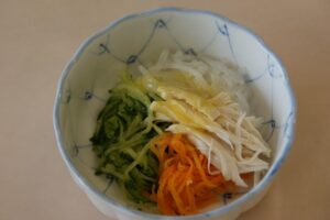 ・胡瓜は千切りにして、30分以上水に浸けておく。