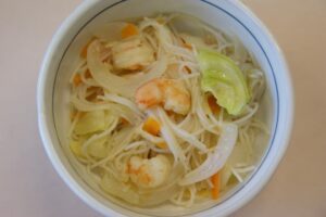・鍋に分量の水と塩、胡椒、コンソメを入れてベースとなるスープを作る。